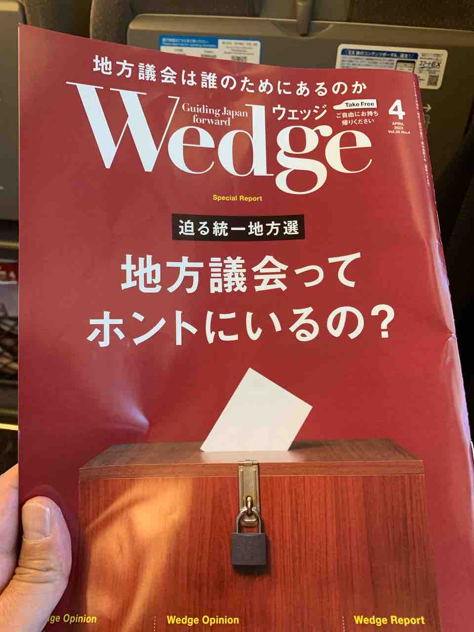 座席の前に「Wedge」という車内誌が挟んでありまして、何気なく手に取ると、「地方議会ってホントにいるの?」という驚きの見出しが!