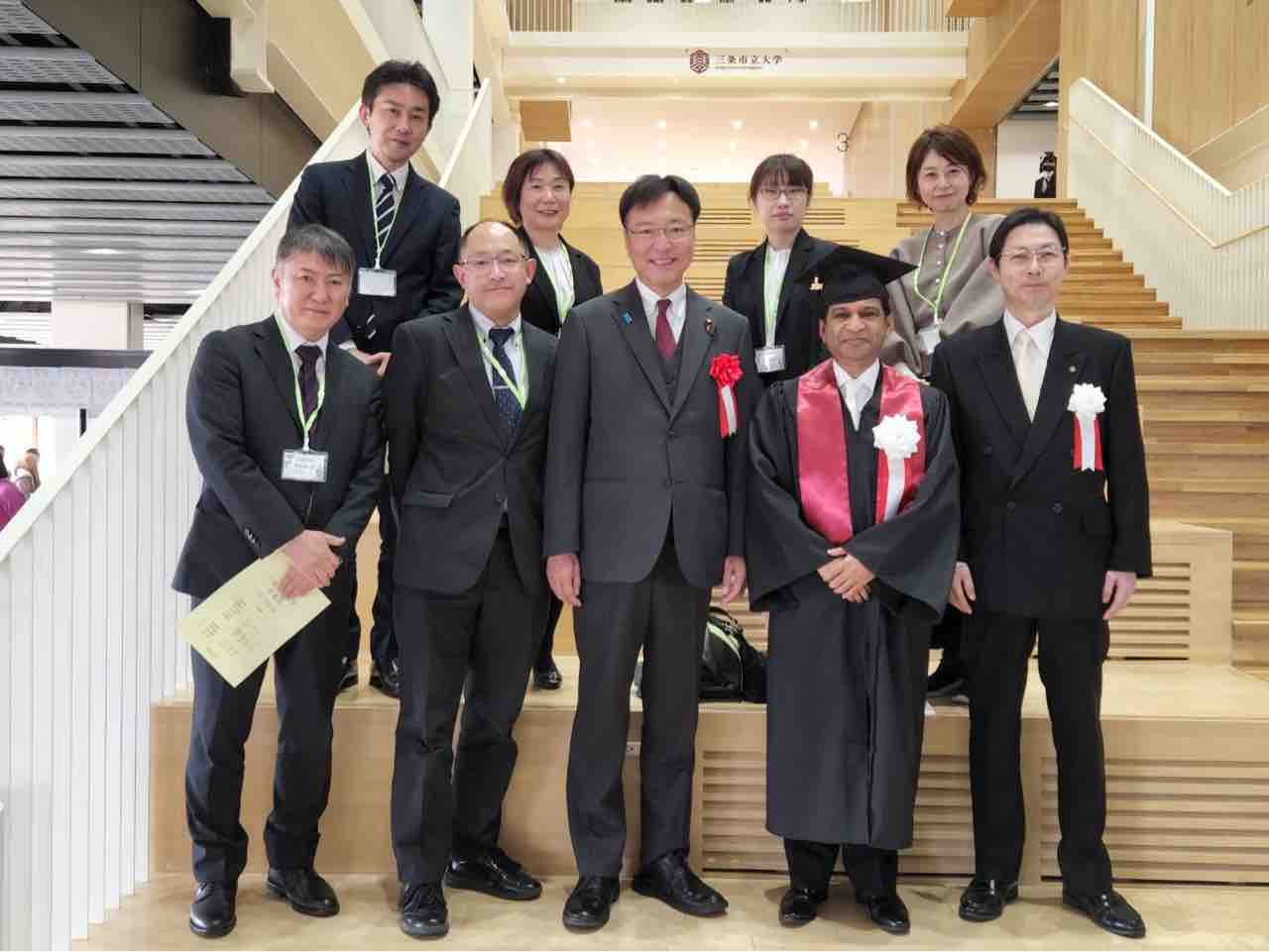 さて、卒業式も終わり、卒業生によるハットトスを待っていると、三条市立大学開学まで労苦を共にした開学準備室メンバー(シャハリアル学長もその1人)がいるではありませんか!